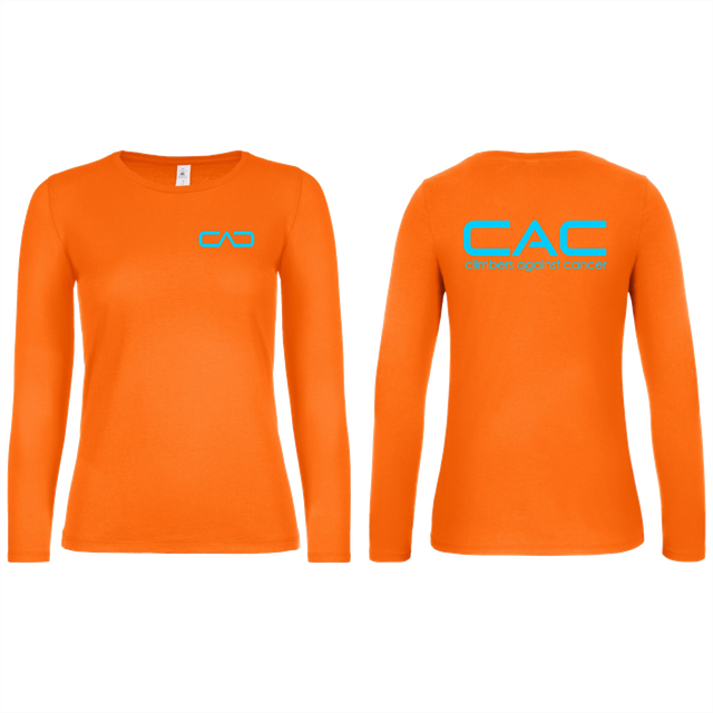 Large CAC logo on the back and small 'glasses' logo on front left chest.